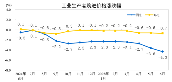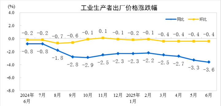 中国经济网北京7月9日讯据国家统计局网站今日披露消息,2025年6月份,全国工业生产者出厂价格同比下降3.6%,环比下降0.4%;工业生产者购进价格同比下降4.3%,环比下降0.7%。上半年,工业生产者出厂价格比上年同期下降2.8%,工业生产者购进价格下降2.9%。